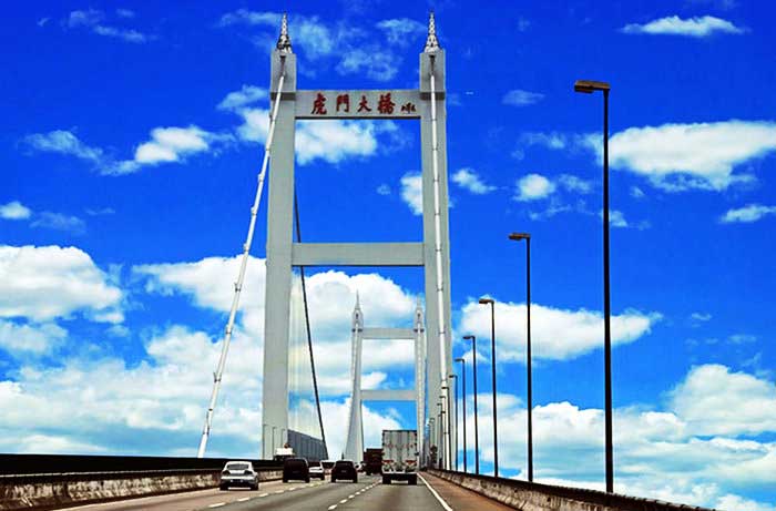 ·虎門大橋飛架珠江口,是中國第一座大型懸索橋,其主航道跨經888米,1999年4月20日通過竣工驗收,居中國前列,被譽為“世界第一跨”。