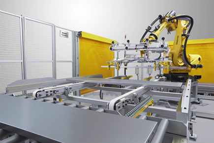日立エレベーターに初のレイヤドア板スポット溶接、塗装、運搬、スタックロボットシステム提供した