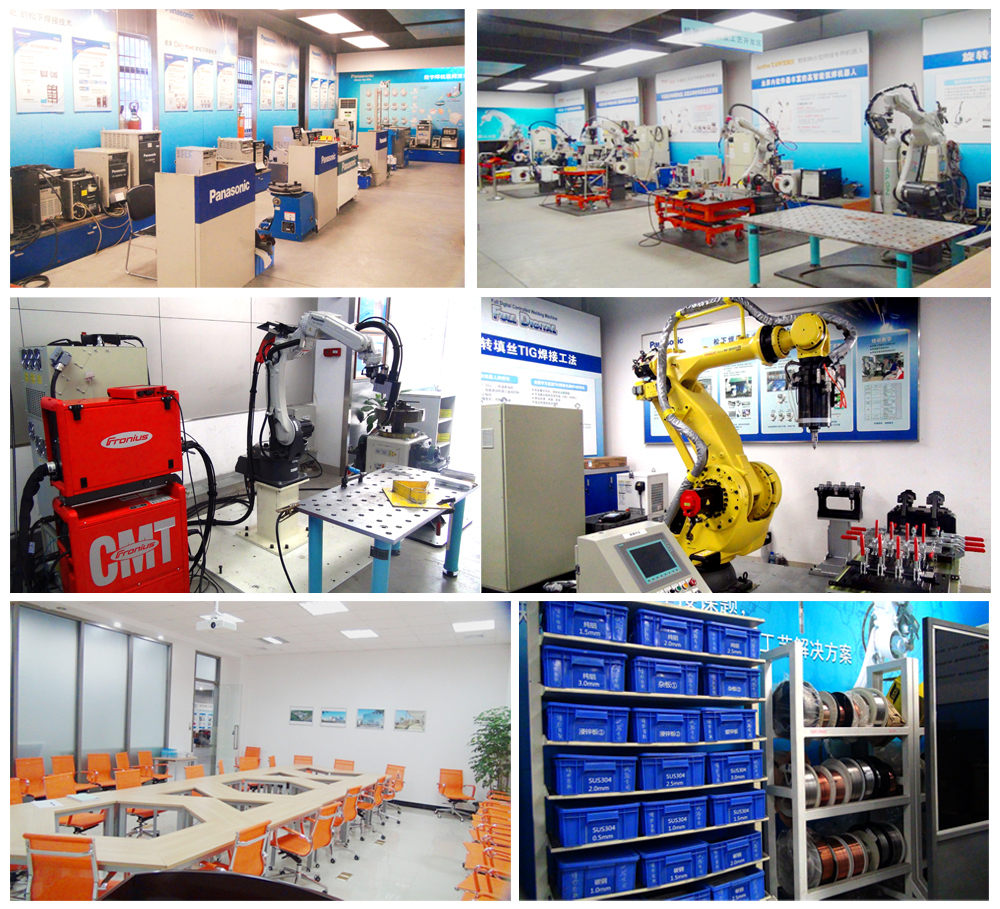本平台拥有500㎡的教学空间和1000㎡的观摩实践基地,拥有现代化专用培训教室2间、11个机器人操作工位和4个手工焊专用操作工位。其中机器人有Panasonic、FANUC、KUKA等多种品牌可选,可用于示教编程、维修、机器人工艺应用等教学,手工焊机包含了熔化极气体保护焊和TIG焊各种型号,焊接材质有碳钢、镀锌板、不锈钢、铝合金、铜合金等各种材质可选。