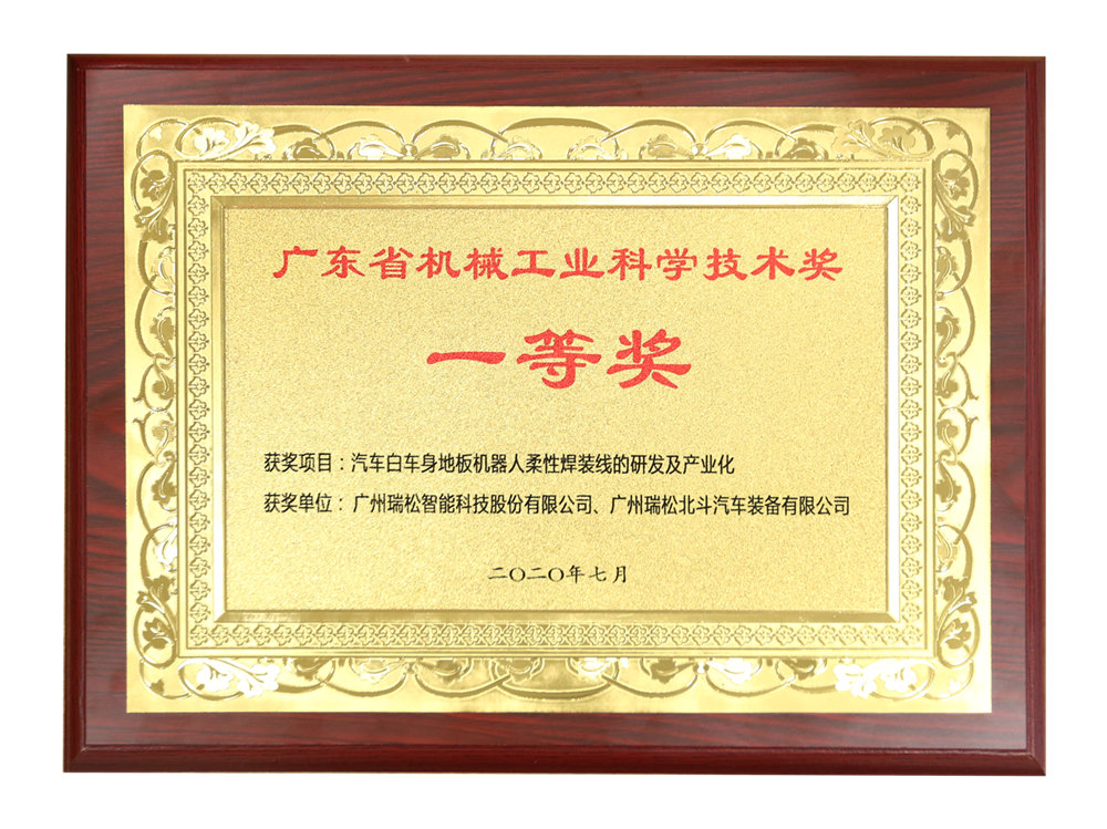 牛宝体育app下载及其下控股子公司广州瑞松北斗汽车装备有限公司《汽车白车身地板机器人柔性焊装线的研发及产业化》项目正式获广东省机械工程学会、广东省机械行业协会颁发2019年度广东省机械工业科学技术奖一等奖、2019年度广东省机械工程学会科学技术奖一等奖奖牌及证书。