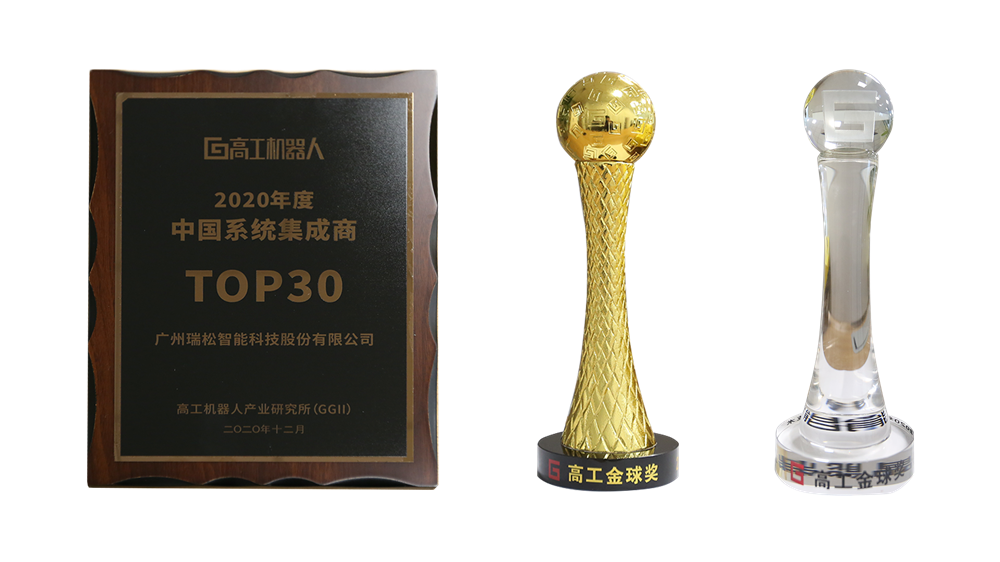 瑞松科技荣获高工机器人【中国系统集成商TOP30】、【年度智能制造应用案例】金球奖以及【年度智能制造技术】水晶球奖等奖项。