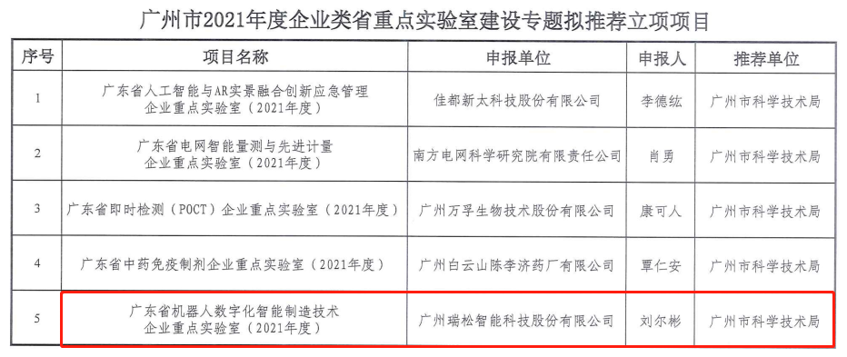 瑞松科技广东省机器人数字化智能制造技术企业重点实验室获广州市科学技术局推荐建设。