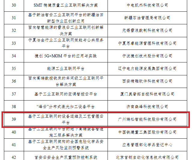 瑞松科技《基于工业互联网的设备运维及工艺管理云平台》项目成功入选工业和信息化部2020年工业互联网试点示范项目平台集成创新应用方向。