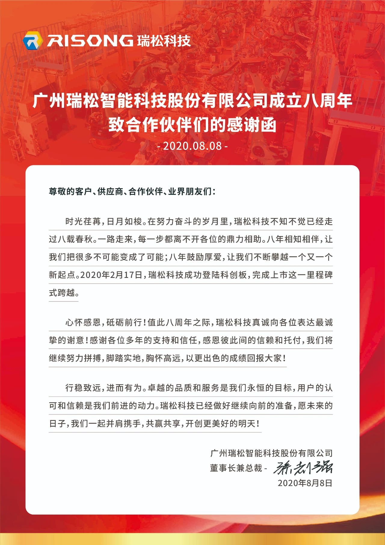 瑞松科技董事长兼总裁孙志强发表《牛宝体育app下载成立八周年致社会各界朋友和合作伙伴们的感谢函》。