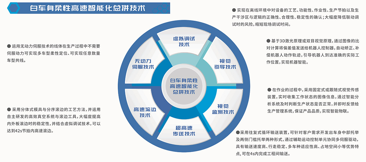 白车身柔性高速智能化总拼技术,系综合运用视觉引导、伺服定位、柔性无源台车、智能车型切换装置、柔性滚边、离线调试等技术,实现白车身柔性高速智能化生产。