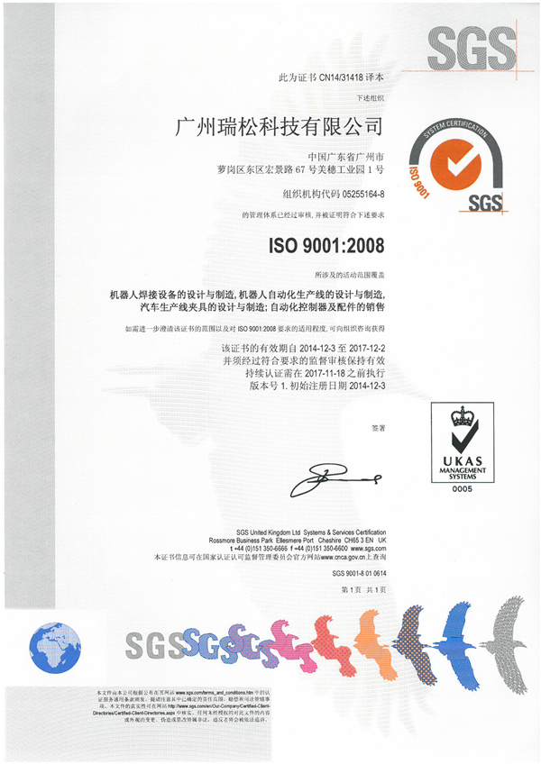 2014年,瑞松科技通过了ISO9001质量管理体系认证,这是国际标准化组织(ISO)用于证实组织具有提供满足顾客要求和适用法规要求的产品的能力。通过ISO 9001质量管理体系的认证,瑞松科技的质量保证达到与国际标准接轨,为更多客户提供可供信任的产品与服务。