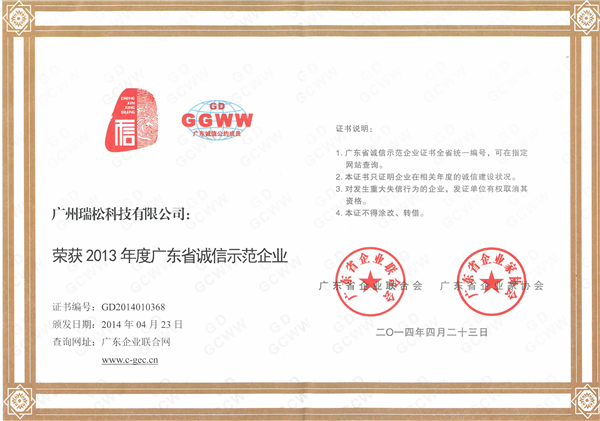 2014年4月23号,瑞松科技荣获由广东省企业联合会和广东省企业家协会联合颁发的“2013年度广东省诚信示范企业”称号。获得此项殊荣,是瑞松科技多年来诚信经营、优良服务的最佳证明,也是社会各界对瑞松科技在履行社会责任、诚信守法等工作的肯定和鼓励。