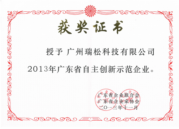 2013年11月,瑞松科技荣获由广东省企业联合会和广东省企业家协会联合颁发的“2013年广东省自主创新示范企业”称号,技术研究与创新是瑞松科技发展的重要助力。